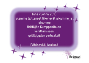 Tänä vuonna 2013 olemme laittaneet liikenevät aikamme ja rahamme Yrittäjän Kumppanitalon kehittämiseen yrittäjyyden parhaaksi! Pöhisevää Joulua! Lue Pöhinäuutiskirje ja liity kirjeen tilaajien joukkoon. Virittäydy kanssamme Joulun