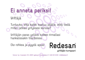 Bloggaajana toisaalla Linkkejä Redesanilaisten kirjoittamiin vierailu blogeihin: Pienestä kii! Mihin meitä kaikkia yrittäjiä tarvitaan? Entä jos kaverilla ei mene hyvin? Yrittäjänä yhden luukun taktiikalla. Joskus